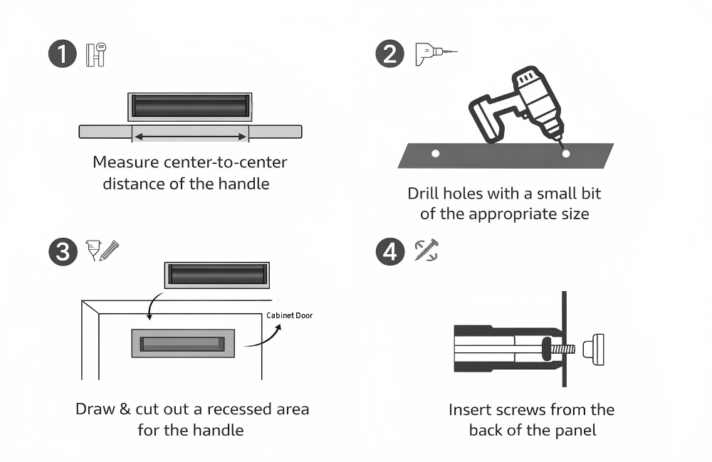 If your furniture or door already has a knob or handle on it, you may be able to unscrew the current one and replace it using the existing screw. If not, you will need to drill a small hole (or holes) in your door or furniture and tighten with a Philips screwdriver.